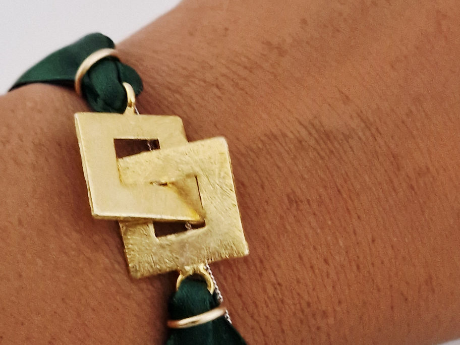 Découvrez un bracelet moderne et élégant, composé de deux carrés entrelacés en argent 925 ou argent doré. Monté sur un ruban de satin (noir, rouge ou vert), il apporte une touche chic et festive à tous vos looks.